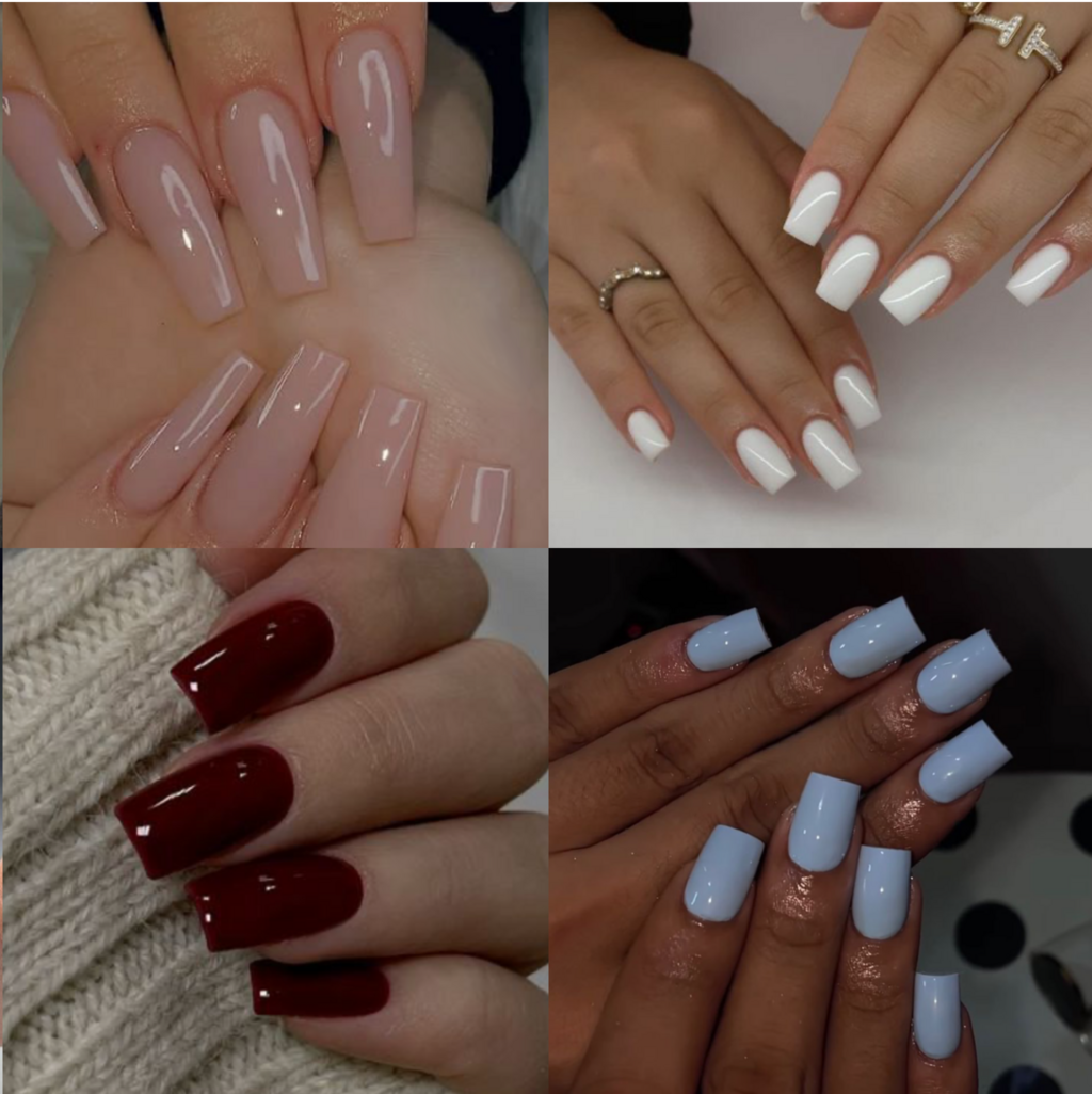 Un ensemble d’ongles d’une seule couleur, sans décoration.